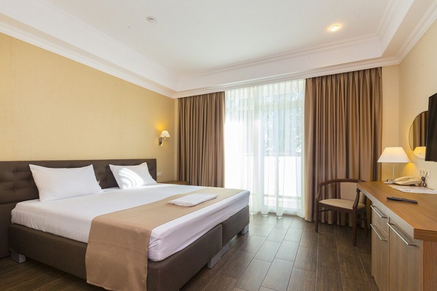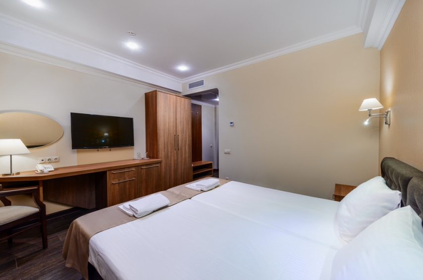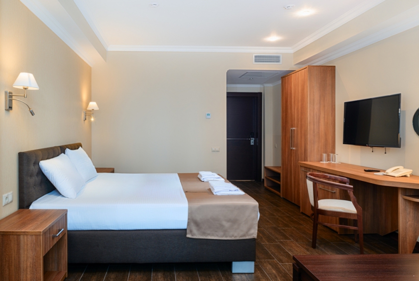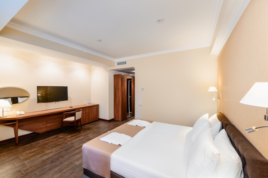 В номере: одна двуспальная кровать или две односпальные кровати, прикроватные тумбочки, туалетный столик, зеркало, стул, шкаф-купе в прихожей, Wi-Fi, система кондиционирования, телевизор, холодильник, сейф.