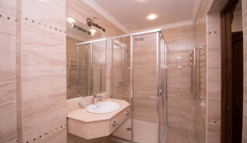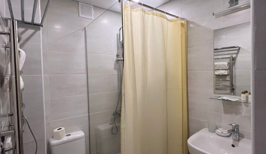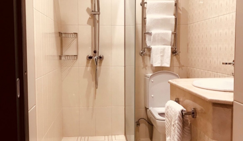 Санузел: умывальник, зеркало, унитаз, душевая кабина, фен, полотенца, косметические принадлежности, полотенцесушитель.