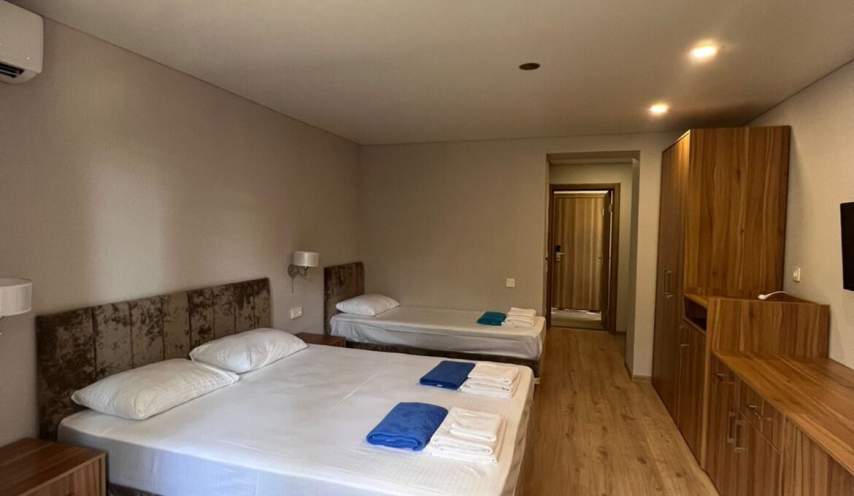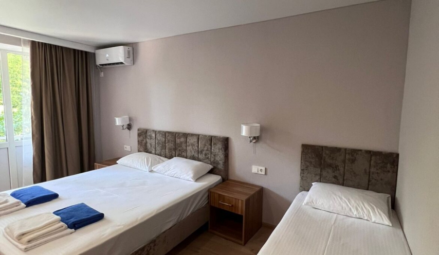 В номере: три односпальные кровати, прикроватные тумбочки, туалетный столик или рабочий стол, зеркало, стул, шкаф, Wi-Fi, кондиционер, телевизор, холодильник.