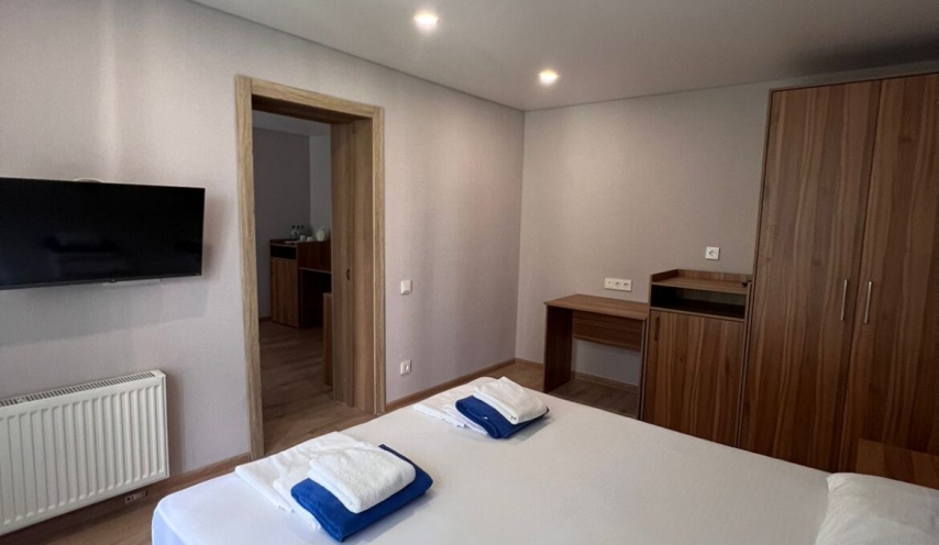 В номере: двуспальная кровать и мягкий диван, кресла или три односпальные кровати, прикроватные тумбочки, туалетный столик или рабочий стол, зеркало, журнальный столик, стул, шкаф, Wi-Fi, кондиционер, телевизор, холодильник.