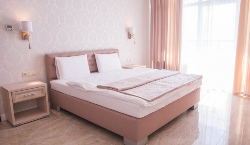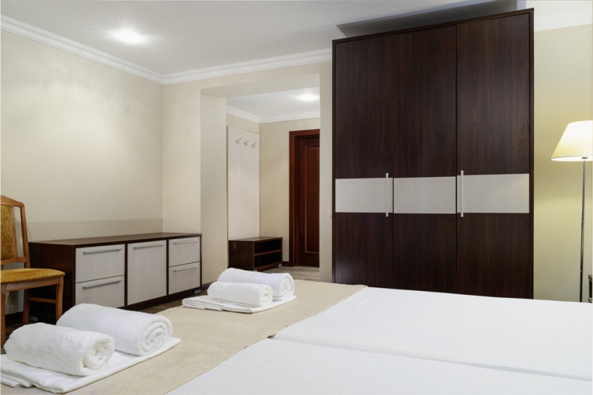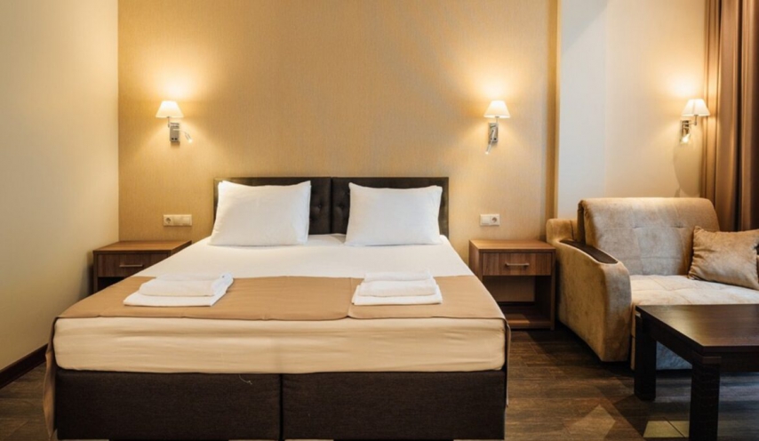 В номере: одна двуспальная кровать или две односпальные кровати, прикроватные тумбочки, туалетный столик, зеркало, стул, шкаф-купе в прихожей, кресло-кровать или раскладной диван, Wi-Fi, система кондиционирования, телевизор, холодильник, сейф.