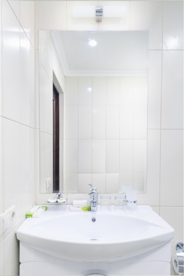 Санузел: умывальник, зеркало, унитаз, душ или ванна, полотенца, косметические принадлежности.