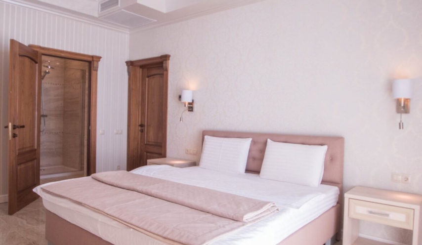 В номере: двуспальная кровать и диван, прикроватные тумбочки, туалетный столик или рабочий стол, зеркало, журнальный столик, стул, шкаф, Wi-Fi, кондиционер, телевизор, холодильник.